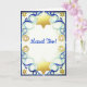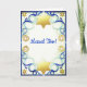 A frente é azul e branca com arabescos dentro de uma moldura azul com motivos de estrela de Davi em dourado falso com a saudação, "Mazel Tov!." O interior diz, "Celebre este dia do seu Bar Mitzvah! Com os melhores cumprimentos." Um cartão simples e elegante.