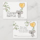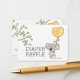 Um cartão de chá de fraldas de fralda de carneiro koala com um urso doce, flutuando de cima, por meio de um balão de cor amarelo ouro, segurado por uma corda de folhas de eucalipto. Este bebê coala veste uma fralda branca com um alfinete de fralda amarelo. Um padrão de bolinhas branco e amarelo pálido na frente e atrás. Uma mãe que está pronta para pop vai adorar essas placas de chá de fraldas de bife de fralda do eucalipto para um menino ou uma festa de chá de fraldas neutra em relação ao gênero. Trabalho de arte © Chrissy H. Studios, LLC. Todos os direitos reservados.