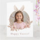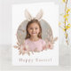 Envie votos calorosos de Páscoa com este cartão de cumprimentos personalizado com a foto do coelho da Páscoa. Com um design de coroa floral em tons pastéis na frente e uma mensagem cuidadosamente escrita no interior, este cartão torna-se um objeto significativo para as celebrações da Páscoa.