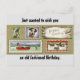 Imagem antiga e incrível de um cão, pescando, jogando golfe, patos e Boas Festas de Aniversário em uma prancha de madeira, está presente neste cartão de aniversário. A frente do cartão diz, "Só queria desejar um aniversário à moda antiga". A parte de trás do cartão diz, "Tenha um Ótimo!". Uma ótima saudação de aniversário para enviar a um amigo ou familiar masculino.