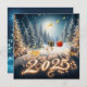 Celebre a magia do Ano Novo com este cartão deslumbrante, apresentando uma floresta coberta de neve iluminada por luzes douradas quentes. Uma mensagem brilhante "Feliz Ano Novo 2025" está lindamente inscrita na neve, rodeada por decorações festivas, presentes cintilantes e cervos dourados saltitantes.
