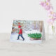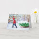 Este Cartão de Natal foi criado a partir de uma fotografia de um menino e um trenó com uma floresta coberta de neve ao fundo. Eu adicionei a árvore de Natal recém-cortada ao trenó e um pássaro cardinal. (Menino trazendo a árvore de Natal para casa) Há uma saudação interna "Que seu lar seja quente e cheio de amor no dia de Natal."