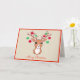 Cartão de Boas Festas de Natal com veado elegante. O veado é decorado com bolas de Natal em fundo bege.