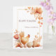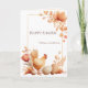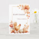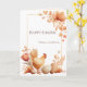 Um cartão de Páscoa caloroso e encantador com uma moldura floral delicada e uma ilustração de uma doce galinha.