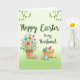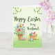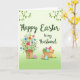 Este cartão apresenta a saudação "Feliz Páscoa para meu Marido" em letras verde-escuras colocadas no centro de um fundo verde-claro, com pequenos acentos de videira enrolados nos cantos superiores. Abaixo das palavras, a cena parece afetuosa e íntima, como se estivesse preparando a mesa para um momento tranquilo de feriado compartilhado entre duas pessoas. À esquerda, há um vaso de flores terracota transbordando com flores em tons de fúcsia, azul-celeste, laranja-sol e roxo-suave, entre folhas verdes e alguns toques de 🌷. À direita, uma tigela marrom quente contém várias formas de ovos lisos em esmeralda, lavanda, azul-claro e amarelo-dourado com listras, sugerindo uma doce tradição feita juntos 🐰. O chão desaparece em tons verdes suaves, dando aos objetos um lugar macio para descansar sem linhas duras. Alguns ovos extras, alguns listrados e outros sólidos, estão espalhados por perto como pequenas surpresas esperando para serem encontradas. O campo verde-claro permanece aberto e arejado em torno do texto central, enquanto
