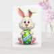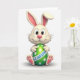 Este cartão apresenta um personagem coelho branco cremoso centrado em um fundo branco brilhante, com olhos escuros brilhantes e um pequeno sorriso que parece uma saudação amigável e afetuosa 🐰. Uma orelha fica em pé enquanto a outra dobra, dando à pequena figura um olhar gentil e tímido. O rosa suave aparece dentro das orelhas e nas almofadas das patas enquanto ele abraça um ovo verde liso perto do peito, como se estivesse oferecendo um presente doce a alguém especial 🐇. O ovo tem pontos brancos arrumados e uma fita azul clara enrolada no meio. Sobre a fita, a palavra “NETO” aparece em letras maiúsculas arrumadas, destacando-se claramente contra a faixa azul. A iluminação é suave e uniforme, com sombras tênues sob o coelho e ao redor do ovo que adicionam profundidade sem escurecer a cena. Bigodes finos se estendem de um pequeno nariz rosa, e destaques brilhantes brilham ao longo da superfície curva do ovo. O fundo permanece simples e brilh