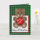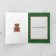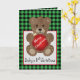 Este ursinho é perfeito para o primeiro feriado do bebê ou para qualquer criança. Este ursinho marrom fofinho está segurando um enfeite vermelho que diz "Feliz Natal". O fundo é um xadrez verde e preto, com uma caixa branca. O texto na parte inferior do painel frontal e o texto interno podem ser personalizados.