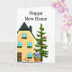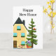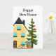 Este cartão de cumprimentos foi criado para novos proprietários de imóveis. A frente do cartão apresenta uma ilustração de uma casa com uma árvore e uma planta em vaso. Há também um cumprimento interno e uma linha para assinatura.