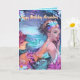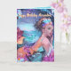 Cartão de aniversário de sereia em aguarela no mar. Este design em aguarela tem muito azul e rosa. O fundo tem ondas do oceano e um céu colorido. A sereia está com o cabelo preso com uma faixa de flores. Mergulhe no encanto! Perfeito para amantes de sereias. Alegrar o dia de alguém com este cartão deslumbrante.