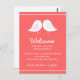 Este cartão de boas-vindas do casamento apresenta dois pássaros bonitinhos encarando um ao outro, um fundo rosa macio e um texto personalizável. A cor do plano de fundo pode ser alterada escolhendo o botão personalizar e, em seguida, editando. Este cartão pode ser anexado a presentes/sacos de boas-vindas para convidados de casamento fora da cidade.