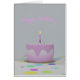 Um bolo de aniversário de desenho cor-de-rosa, com glacé coberto por uma mola, correndo pelas laterais e uma vela acesa, colocada sobre uma placa de ouro num balcão coberto de pontos coloridos.