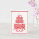 Cartão de felicitações de casamento é mostrado com uma impressão gráfica de um bolo vermelho chique.