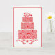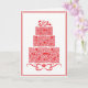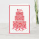 Cartão de felicitações de casamento é mostrado com uma impressão gráfica de um bolo vermelho sofisticado.