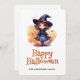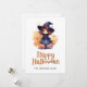 Feliz cartão de Halloween com a ilustração aquática de uma bruxa num chapéu. Personalize facilmente este cartão de Dia das Bruxas fofo para crianças com seu nome e texto de família.