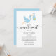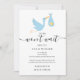 Aconteça o que acontecer, o bebê não pode esperar, embora a festa possa. Mantenha todos atualizados com este cartão fofo com uma cegonha azul entregando uma entrega especial de estrela dourada em um fundo branco com letras modernas e elegantes. Criado por Thisisnotme©