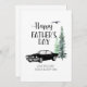 Um cartão do Dia dos Pais feliz com um design de carro antigo e árvores de pinho. Tem um espaço que pode ser personalizado com nomes e uma mensagem curta.