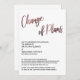 Em uma fonte de letra manuscrita moderna e ousada, criei um gráfico que diz simplesmente "Mudança de Planos"; esta imagem foi adornada com um efeito suave de rose gold metálico falso. Abaixo deste cabeçalho estão campos de modelo para adicionar seus detalhes pessoais. Todo o texto editável aparece em uma fonte sans-serif em maiúsculas, em preto; isso pode ser alterado se desejar. // 105 //