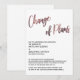 Em uma fonte de letra manuscrita moderna e ousada, criei um gráfico que diz simplesmente "Mudança de planos"; esta imagem foi embelezada com um efeito suave de rosa dourada metálica falsa. Abaixo deste cabeçalho estão campos de modelo para adicionar seus detalhes pessoais. Todo o texto editável aparece em uma fonte sem serifa em maiúsculas, em preto; isso pode ser alterado se desejar. // 105 //