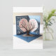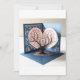 Esta imagem mostra um cartão de casamento 3D aberto. O design mostra uma árvore com galhos ramificados que sustentam folhas em forma de coração rosa, simbolizando amor e romance. O fundo azul tem detalhes finos de gravuras brancas que adicionam um toque artístico e estético ao cartão. O design é inovador e atraente, refletindo sentimentos de amor e conexão, tornando-o muito adequado para uso em ocasiões de casamento