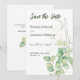 Cartão de casamento minimalista para salvar a data com folhagem de eucalipto suave e tipografia limpa. Este design botânico moderno é ideal para casamentos contemporâneos, minimalistas ou com folhagens. Totalmente personalizável com os detalhes do seu casamento para um anúncio simples e elegante.