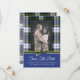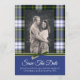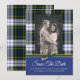 Cartão de save the date de casamento personalizado com foto feito em cartão stock plano com gráficos do padrão xadrez escocês clássico do clã Gordon Dress. A parte inferior da frente do cartão é feita em azul sólido com gráficos de uma fita verde, no topo. Personalize com sua foto de noivado e texto para atender às suas necessidades. Produtos de casamento Gordon Dress correspondentes estão disponíveis.
