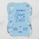 Anuncie seu dia especial com estilo neste cartão de casamento "Save the Date" lindamente desenhado. Com delicadas flores de hortênsias azuis e uma elegante caligrafia em um fundo azul suave, este convite define um tom romântico para o seu casamento em outubro. O cartão destaca a data do casamento (domingo, dia 12) e horário (18h), tornando-o atraente e informativo. Perfeito para casais que procuram uma combinação de beleza e simplicidade em sua papelaria de casamento.