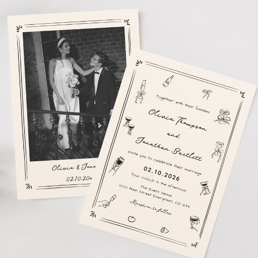 Cartão de Casamento Preto e Branco Desenhado à Mão