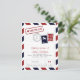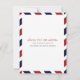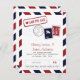 Cartão de Save the Date Inspirado em Correio Aéreo em Vermelho e Azul. Marcações de Selo Falso e Postagem para um Casamento com Tema de Viagem.