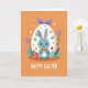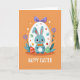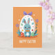 Projetado com um coelho azul estilizado no centro 🐰, a ilustração usa formas arredondadas suaves, orelhas compridas, bochechas rosadas e um sorriso amplo, com uma pequena gravata laranja que adiciona um toque doce e amigável. O coelho senta-se diante de um grande fundo em forma de ovo branco, como um holofote que enquadra seu rosto e faz a expressão parecer ainda mais calorosa. Atrás dele, um campo laranja suave preenche a cena, dando aos azuis mais frios um contraste suave e mantendo tudo brilhante e primaveril. Ao redor do coelho, ovos decorados em vermelho, verde, azul e amarelo são espalhados com pontos e listras, como se tivessem sido colocados ali para uma pequena celebração compartilhada. Ao longo da borda inferior, flores roxas com centros amarelos surgem de caules verdes folhosos 🌷, e o espaçamento próximo faz a cena parecer um momento de jardim aconchegante. Pequenas formas de explosão de estrelas brancas e sutil ênfase circular flutuam pelo fundo, adicionando um brilho leve e sonhador sem lotar a figura principal. As palavras “FELIZ PÁSCOA” aparecem em letras brancas