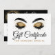 Um cartão personalizado de certificado de presente para clientes, familiares e amigos! Glamour moderno para artistas maquiadores, bares de chicote e de sobrancelha, cosmetólogos independentes, estilistas e além! Negrito em preto e branco com um pop de brilho dourado. Estilhaços e silhueta de sobrancelhas em tendência para o salão de stand-out! ・ Personalize-o! Clique no botão "Personalizar" para alterar fontes, dimensionamento e layout. ・ Navegue na Coleção Luxe Glamor Lashes & Brows para todos os produtos coordenadores de marcas e marketing, inclusive cartões de visitas, materiais de marketing e muito mais!