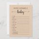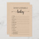 Adquira este jogo e desfrute de um cartão de bebê do Word Scramble de alta qualidade para o seu evento! Design de papel Kraft neutro por gêneros. RESPOSTAS: 1 FRASCO, 2 WIPES, 3 ALTAS CADEIRAS, 4 EMBALAGENS, 5 FRALDAS, 6-ASPIRATOR, 7-ONESIES, 8-BEBÊ LOTION, 9-BOOTIES, 10-BLANKET, 11-BREASTEADING, 12-MOTHERHOOD