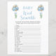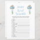 Este cartão de jogo de dois lados apresenta uma contração de palavras na frente e no bingo na parte de trás, e é perfeito para um chá de fraldas ou um borrifo de bebê. Este jogo de palavras "scramble" apresenta balões de aquarela azuis e botânicos de eucalipto verde-sábio. Você pode personalizar este design clicando em "Personalizar este modelo" ou se quiser alterar a fonte, as cores ou organizar os elementos design de uma forma diferente, você pode clicar em "Editar usando a Ferramenta Design". Tecla de Resposta: 1. Fralda 2. Bassinet 3 Frasco 4. 5. Pacificador 6. Mudando a Mesa 7. Animal recheado 8. Rolador 9. Borracha Ducky 10. Cobertura 11. Junto 12. Fórmula 13. Alta Presidente 14. 15. Termômetro 16. Bebê 17. Leite 18. Boies 19. Um lado 20. Urso de Pelúcia