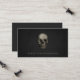 cartão de chamada misterioso com crânio humano assustador em fundo negro.