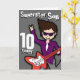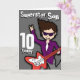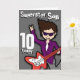 Este cartão diz "Filho Superstar 10 hoje. Dentro: "Parabéns". Ou personalizar com suas próprias palavras. Cartão divertido com um garoto com cabelo escuro e ilustração de pele clara e design por Sarah Trett.