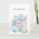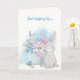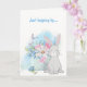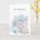 Na frente deste cartão de felicitações para todas as ocasiões há um vaso cheio de lindas flores de primavera em tons pastéis de rosa, azul e verde. Ao lado do vaso de flores está um adorável coelho, e uma borboleta esvoaça por perto. O texto azul correspondente no topo diz "Só de passagem...". O interior do cartão tem outra imagem do coelho sentado entre flores azuis, e o texto "...para dizer OLÁ!". Todo o texto é facilmente personalizado para o que você quiser, por isso é fácil adaptar este lindo cartão para a Páscoa, um aniversário ou um cartão de pronto restabelecimento. Faça-o dizer o que você quiser!