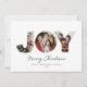 Um cartão de Natal com colagem de fotos e um grande letreiro de alegria em uma fonte simples e negrito em um cartão branco. Personalize este cartão com 3 fotos e uma saudação personalizada.