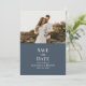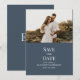 Anuncie seu dia especial com estilo com nosso Cartão de Compromisso de Data de Casamento Moderno em Azul Ardósia com Foto Personalizada. A metade superior apresenta uma foto, complementada por texto branco contra um fundo azul ardósia abaixo. A parte de trás exibe monogramas brancos elegantes em um fundo azul poeirento. Uma maneira sofisticada e personalizada de marcar a data do seu casamento.
