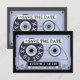 Cartão de Compromisso de Fita Cassete Preta Retro. Anuncie o seu grande dia com este impressionante design de fita cassete retrô em preto e cinza suave. Perfeito para amantes de música, casais ousados e temas de casamento modernos ou arrojados. Uma maneira elegante e nostálgica de se destacar da multidão.
