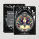 Cartão de Save The Date de Casamento Com Design Floral em Preto. A frente retrata um design de mulher no estilo Mucha. A parte de trás contém os detalhes personalizados do casamento planejado.