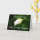 Fotografia original de um botão de rosa branca com orvalho nas pétalas. A frente do cartão declara "Pensando em Você Com Sincera Condolência." A escritura bíblica de Filipenses 4:7 está incluída no interior e um sentimento significativo de "Hoje e sempre, que as memórias carinhosas lhe tragam paz, conforto e força." Você também pode adicionar mais texto de sua escolha, se desejar.
