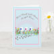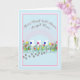 Esta bonito design de simpatia tem 3 Gatos brancos, com flores ao seu redor, com um arco-íris cor-de-rosa no fundo e pegadas correndo ao longo do chão. Cartão perfeito para uma pessoa que perdeu três gatos.