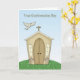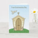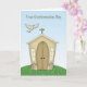 Um cartão de confirmação com pomba em uma igreja na colina