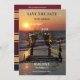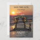 Cartão de confirmação de data com um pôr do sol na praia com um roseiral e luzes de corda. No verso há espaço para sua própria foto. Você pode usar o modelo de código QR para linkar para seu próprio site.