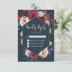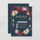 Moderno, Elegante, Burgundy Marsala Navy e Peach Floral Aquarela | Cartão de resposta de casamento com moldura geométrica. Rosas pintadas em aquarela burgundy, marsala, navy, arranjo floral botânico cor-de-rosa com folhas verdes em fundo azul-marinho. Apresenta um design de tipografia manuscrita elegante com o texto "Kindly Reply". Ótima escolha para casamentos de outono, inverno ou qualquer estação. #3339 Se precisar de ajuda ou itens correspondentes, por favor entre em contato.