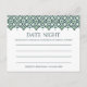 Uma fronteira espanhola de azulejo em tons deslumbrantes de verde florestal adoram estas cartas. Use esses cartões elegantes na sua festa de chá de panela para que os convidados compartilhem suas ideias noturnas favoritas para o novo casal. Use o modelo para adicionar o nome e a data do chá da noiva e os nomes da noiva e do noivo futuros. Faz uma bela manutenção para a noiva, e um alternativo excelente para noivas que querem algo um pouco diferente dos jogos habituais!