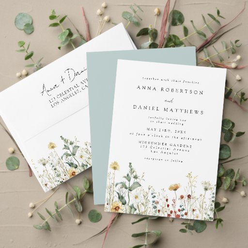 Este design apresenta uma borda de aquarelas de flores silvestres em tons de ouro, vermelho, azul e verde. Perfeito para primavera e casamentos de verão.