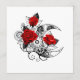 Contorno, lua da crista mecânica com engrenagens, decorada com rosas vermelhas com caules e folhas pretas em fundo branco. Steampunk