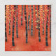 Uma pintura paisagística moderna de uma floresta de pássaros ou aspinheiros no outono, em tons ricos de vermelho, laranja e amarelo.