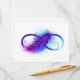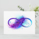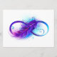Símbolo do infinito com uma bela pena pintada em cores vibrantes roxas e azuis sobre um fundo branco.