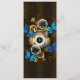 Composição do relógio de aço redondo com discagem numérica romana preta, decorado com engrenagens de ouro e latão, borboletas morfo azuis e lentes danificadas sobre fundo listrado castanho. Estilo Steampunk.